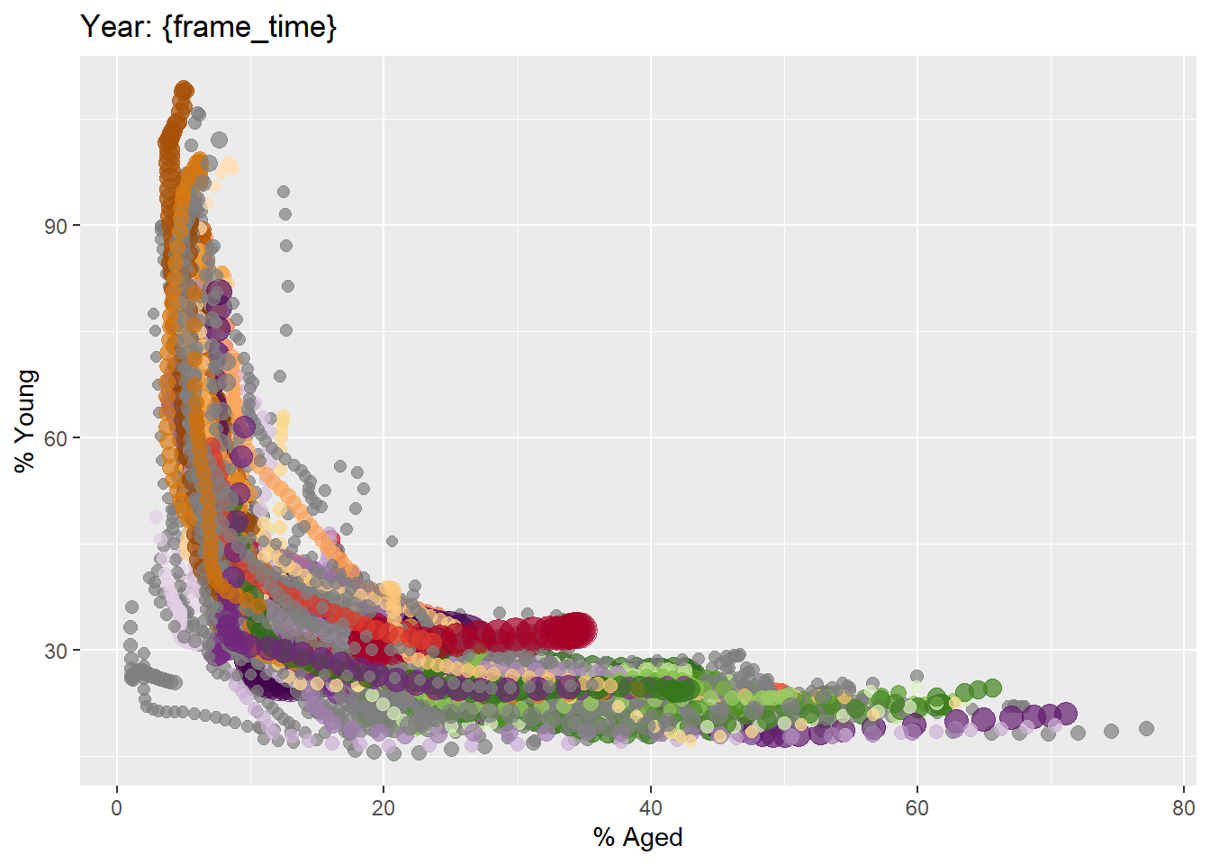 ggplotly(gg)The animated bubble plot above includes a play/pause button and a slider component for controlling the animation