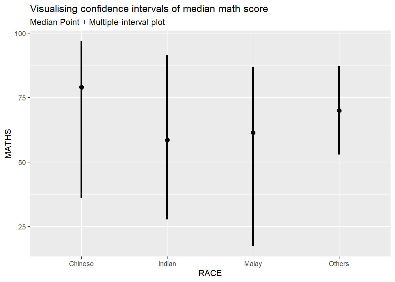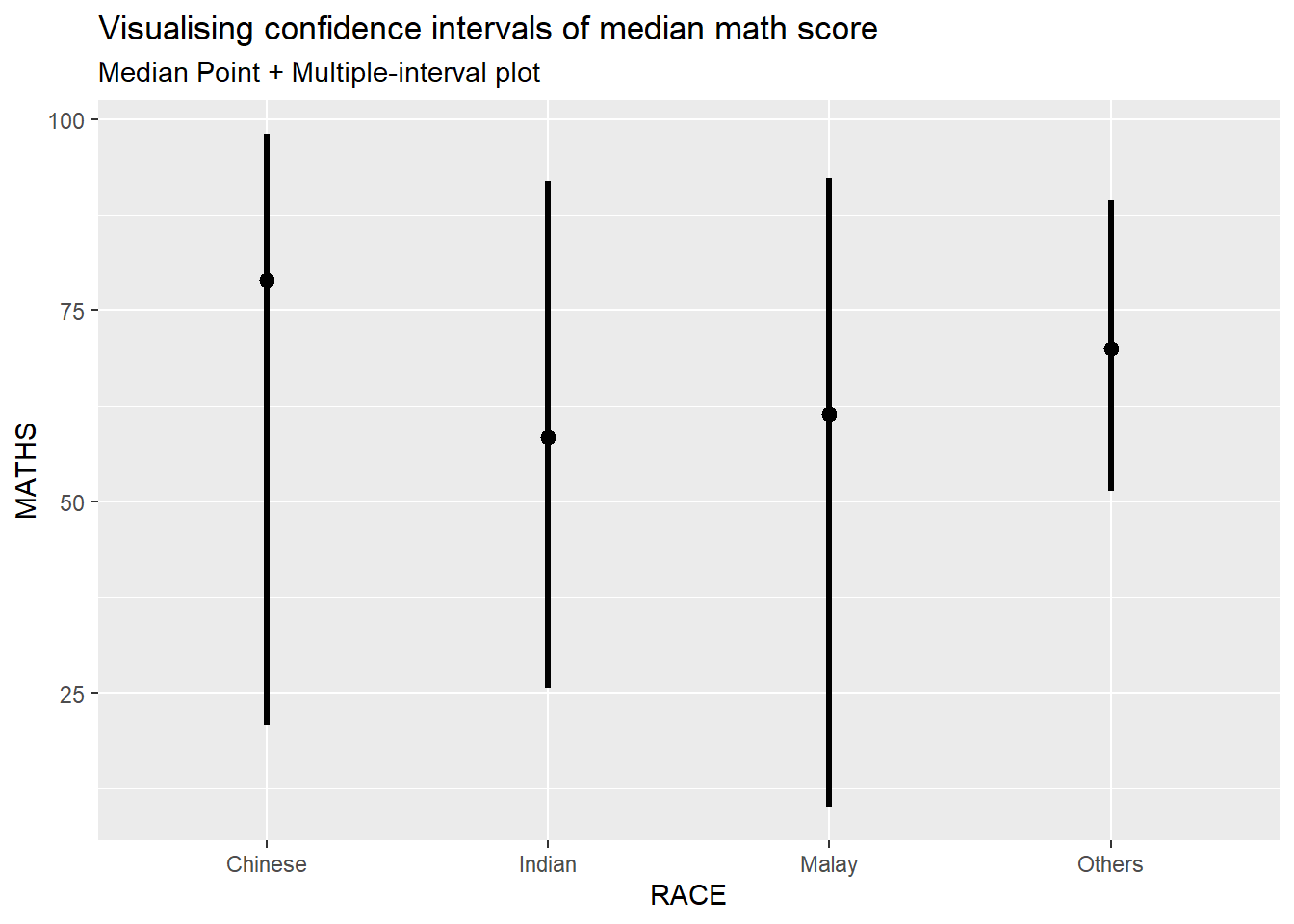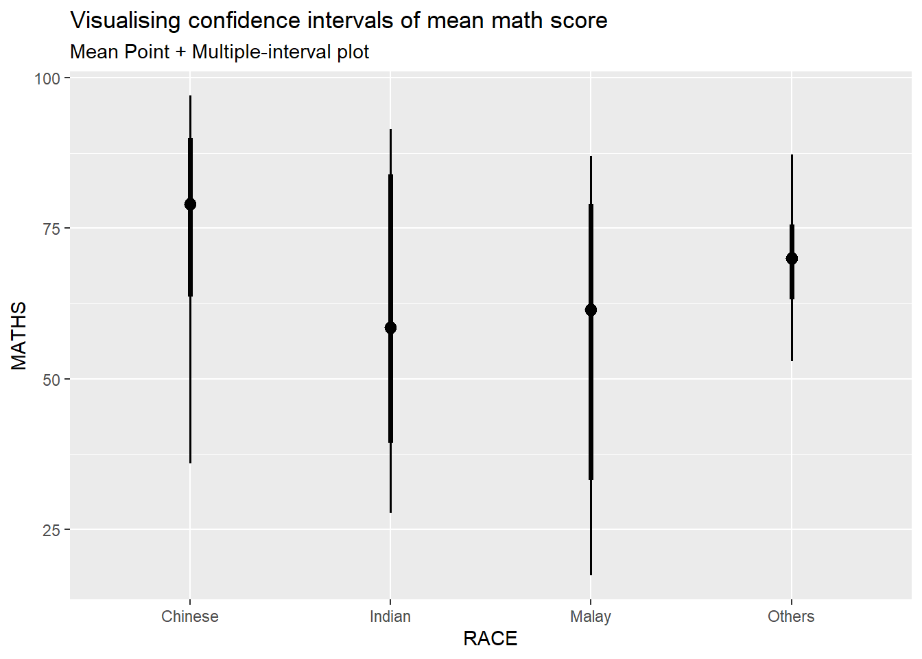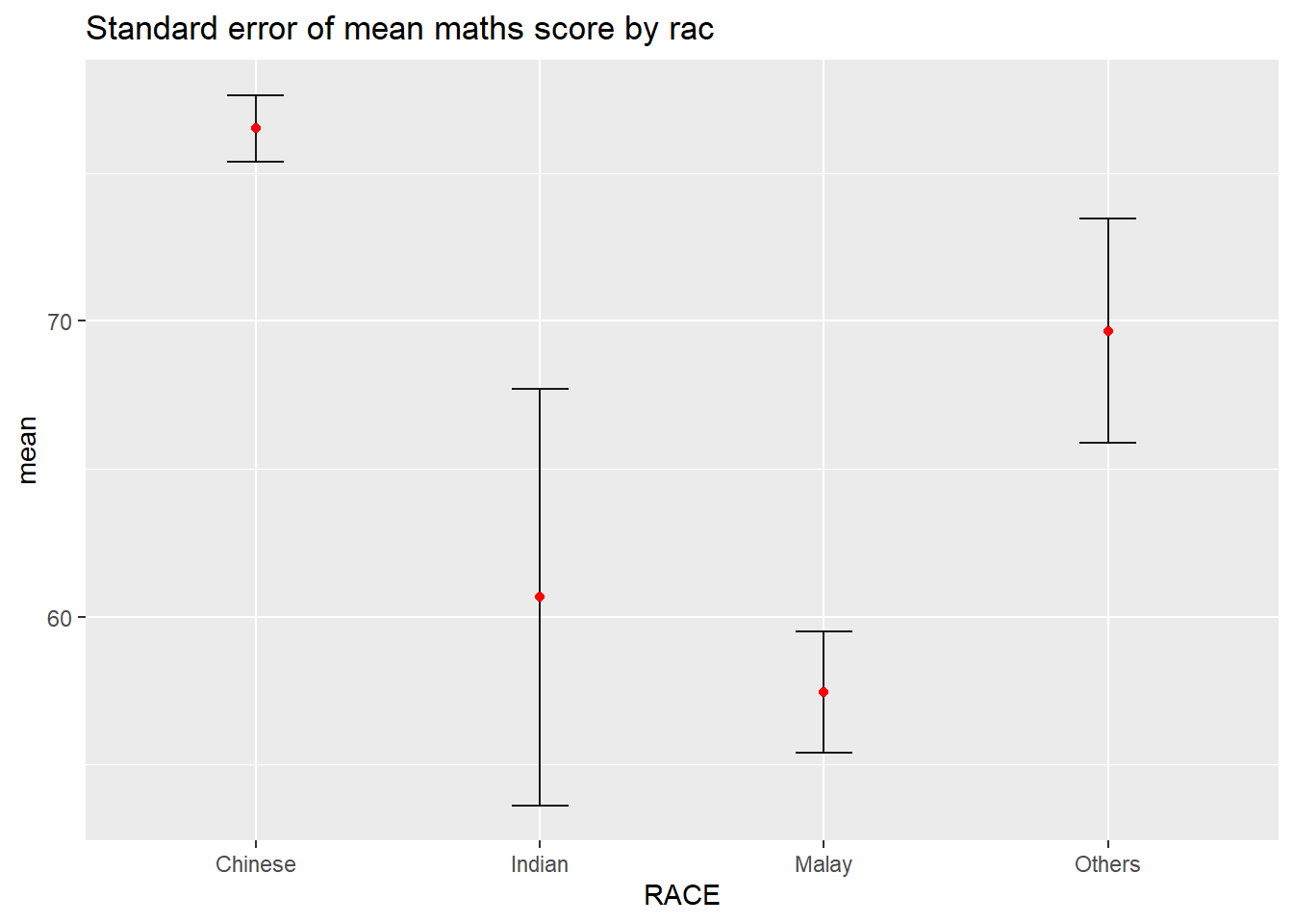 In this section, you will learn how to plot error bars of maths scores by race by using data provided in exam tibble data frame.