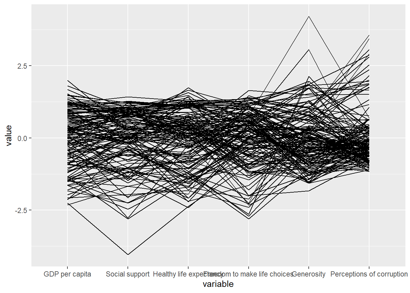 wh <- read_csv("data/WHData-2018.csv")Plotting Static Parallel Coordinates Plot