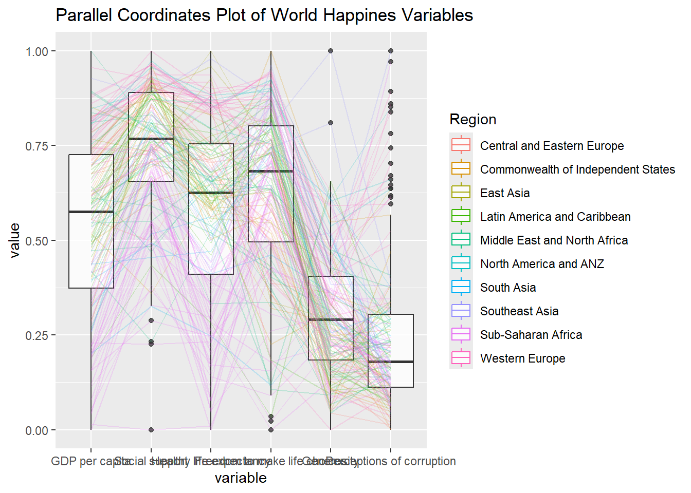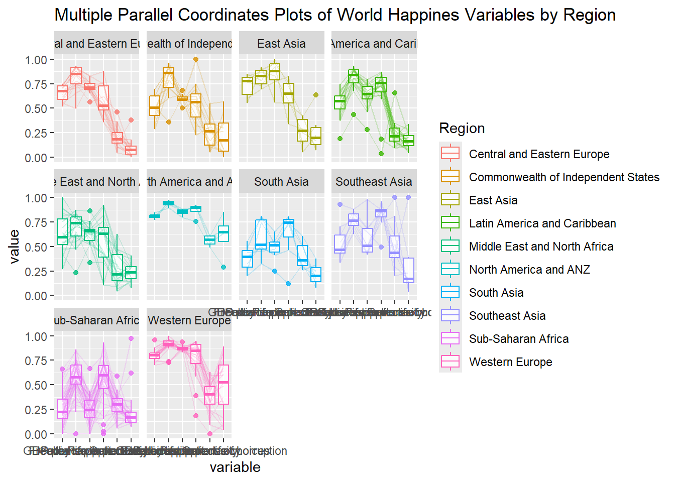 title = "Multiple Parallel Coordinates Plots of World Happines Variables by Region") +