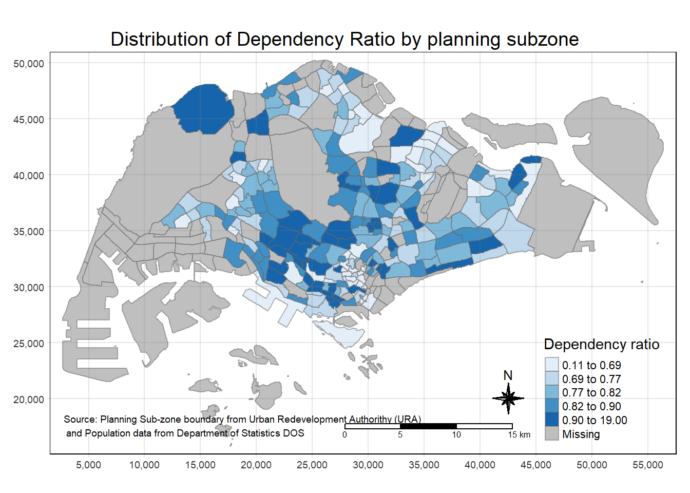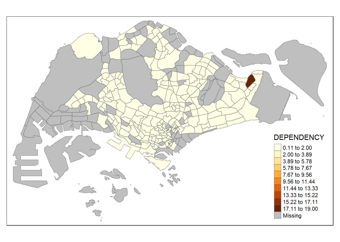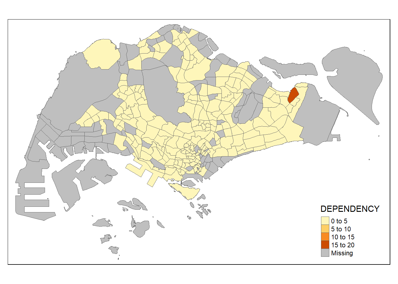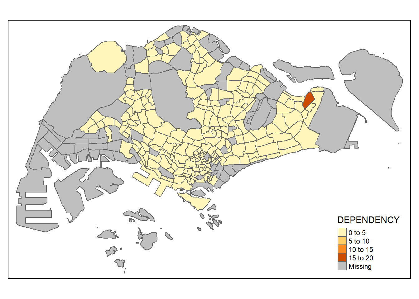 To draw a choropleth map showing the geographical distribution of a selected variable by planning subzone, we just need to assign the target variable such as Dependency to tm_polygons().