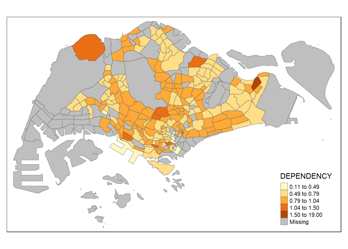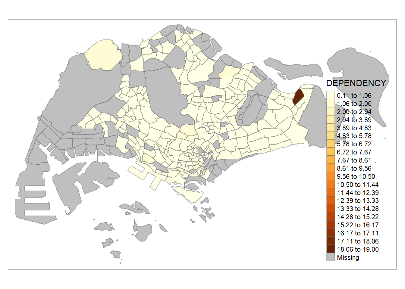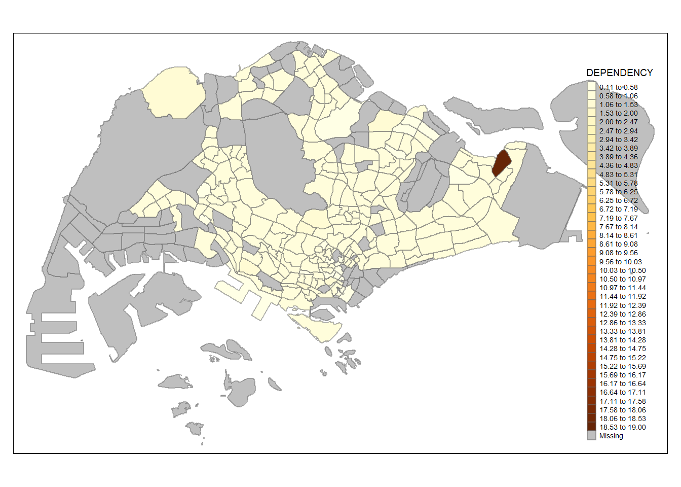 Before we get started, it is always a good practice to get some descriptive statistics on the variable before setting the break points. Code chunk below will be used to compute and display the descriptive statistics of DEPENDENCY field.